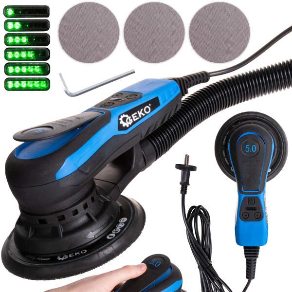 150 mm-es szénkefe nélküli excenter csiszoló GEKO kiváló eszköz a szakemberek számára, akik megbízható partnert keresnek a munkájukhoz. Sokoldalúságának és fejlett kialakításának köszönhetően lehetővé teszi a pontos csiszolást és különböző bevonatok eltávolítását a felületekről. Az ergonomikus, gumírozott fogantyú biztosítja a biztos fogást még hosszabb munka során is, csökkentve a kéz fáradását. Biztonságos billenőkapcsoló, amely a felhasználó kezénél helyezkedik el , tovább növeli a munka kényelmét és biztonságát, azonnali leállítást biztosítva az eszköz leejtése esetén. Műszaki adatok: