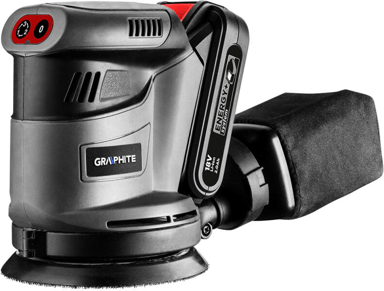 A GRAPHITE excentercsiszoló a 18V Li-Ion GRAPHITE Energy+ akkumulátorokkal kompatibilis. A csiszológép talpának átmérője 125 mm, a csiszolópapírt tépőzárral lehet rögzíteni. A berendezés három különböző fordulatszámon üzemel: 5000/7000/9000/min, melyhez a következő oszcillációs értékek tartoznak: 10000/14000/18000/min. Az oszcilláció amplitúdója 2.7 mm. A fogás helye csúszásgátló bevonattal ellátva, ami kényelmessé és biztonságossá teszi a munkavégzést akár egy kézzel is. A csiszológép hatásos porelszívással rendelkezik, ennek köszönhetően a por és a forgácsok nem zavarják a munkavégzést. A csiszológép készlethez tartozik: porfogó textilzsákos tartály és csiszolópapír.